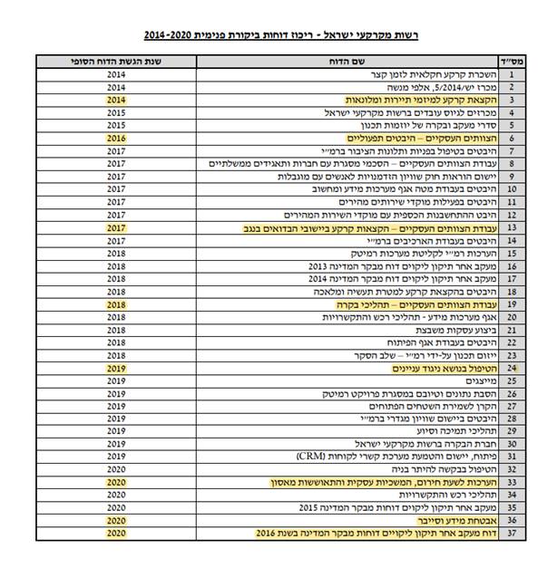 רשות מקרקעי ישראל - דוחות ביקורת (דוח ביקורת עבודת הצוותים העיסקיים תהליכי בקרה, דוח ביקורת הצוותים העיסקיים היבטים תפעוליים, דוח ביקורת הקצאת קרקע למיזמי תיירות ומלונאות, דוח ביקורת עבודת הצוותים העיסקיים הקצאת קרקע ביישובים בדואים, דוח ביקורת ליקויים דו